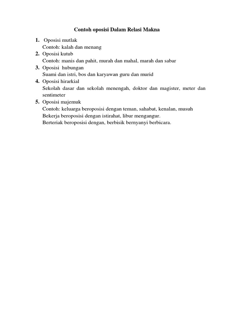 Indonesia Sekolah Menengah Atas 5 Contoh kata oposisi kutub Oposisi majemuk Oposisi hubungan 1. 12012017 Oposisi eksklusif merupakan pertentangan antara dua pernyataan universal kategoris yang berbeda kualitas atau pertentangan dua pernyataan yang berkualitas sama tetapi berbeda kuantitas dengan term-term yang sama. 461 gramatikal diartikan sesuai dengan tata bahasa.