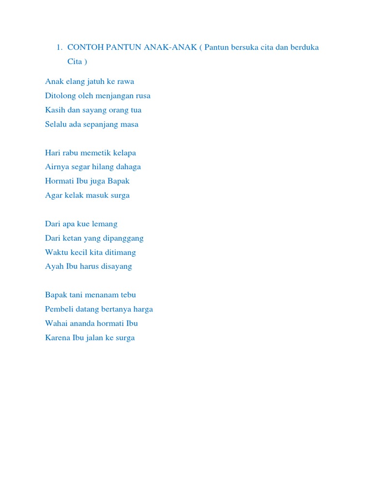 Misalnya ketika orang tua menyuruh belajar maka anak segera melakukan perintah tersebut. Isi pantun tersebut yaitu hendak menasehati agar menjadi anak yang patuh terhadap orang tua. Elok rupanya si kumbang jati Asam kandis asam gelugur Dibawa itik pulang petang Kedua asam riang-riang Tidak terkata besar hati Menangis mayat di pintu kubur Melihat ibu sudah datang Teringat badan tidak sembahyang 2 PANTUN ORANG MUDA 4 PANTUN JENAKA Contoh.